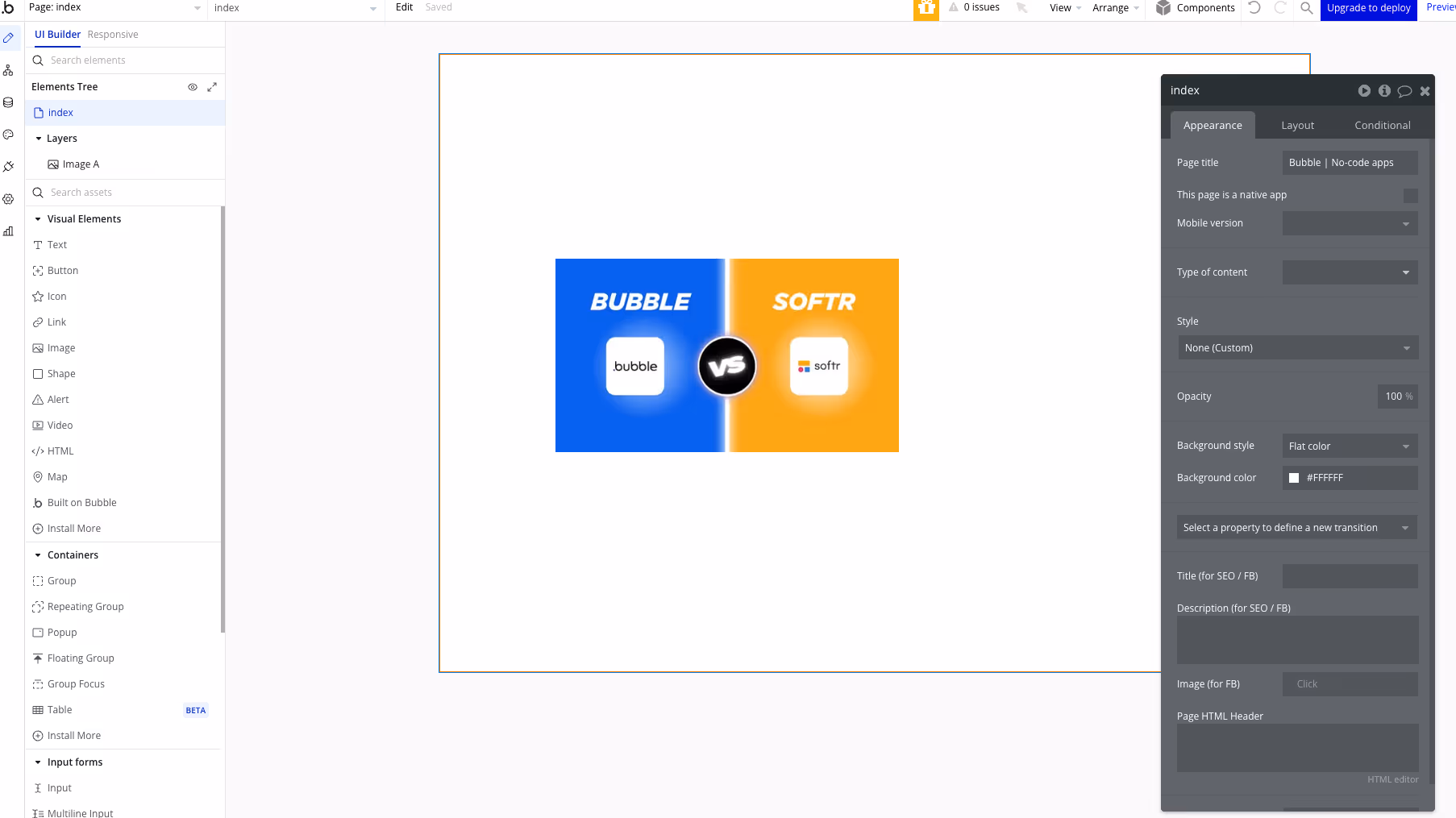 - Éditeur visuel : Bubble propose un éditeur visuel où vous pouvez concevoir chaque élément de votre application. Cela vous permet de créer des interfaces utilisateur sur mesure.