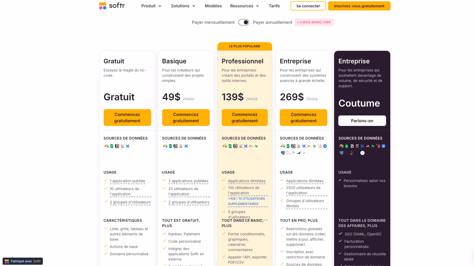 La tarification est un autre aspect crucial à considérer. Softr propose un plan gratuit généreux qui permet aux utilisateurs de créer des applications simples sans frais. Ce plan inclut également la possibilité d'utiliser un domaine personnalisé, ce qui est un avantage significatif pour les petites entreprises ou les projets personnels.