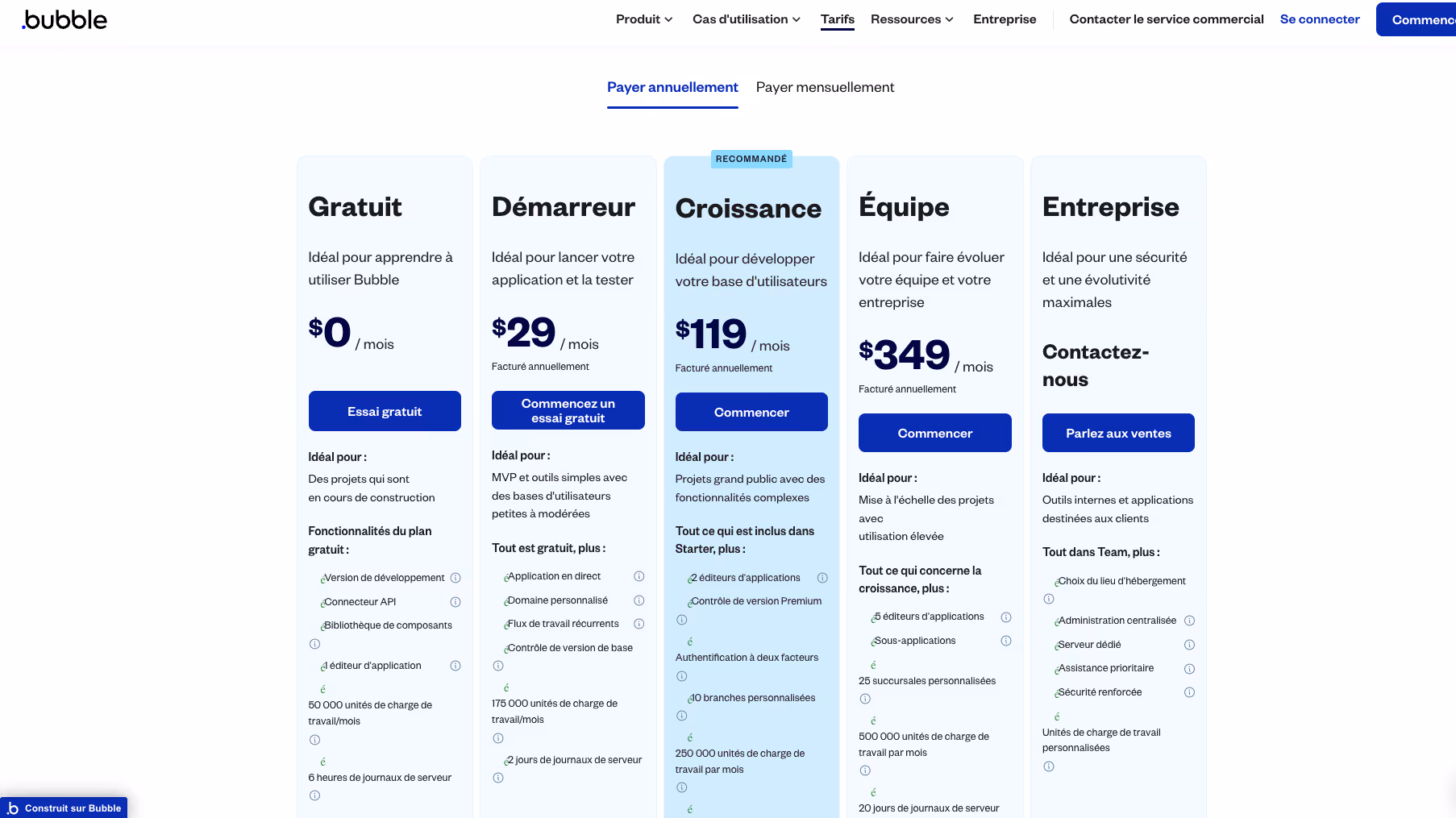 Bubble, bien qu'il propose également une version gratuite, impose des restrictions sur les fonctionnalités avancées. Pour accéder à un domaine personnalisé et à d'autres fonctionnalités, les utilisateurs devront opter pour un plan payant. Il est donc essentiel de bien évaluer vos besoins avant de faire un choix.